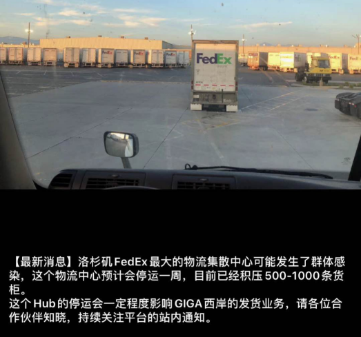 - 7月22日,有卖家爆料称,洛杉矶FedEx最大的物流集散中心可能发生了群体感染,预计将停运一周。