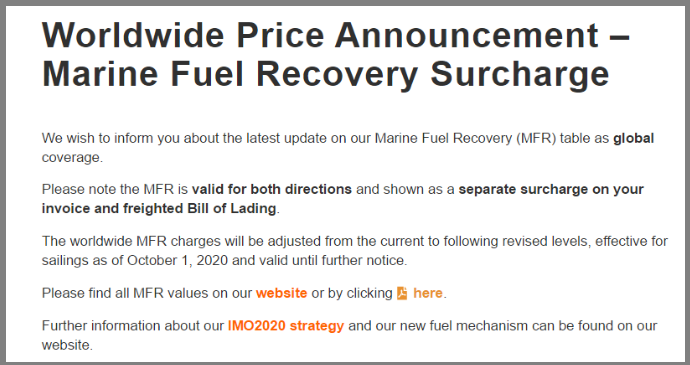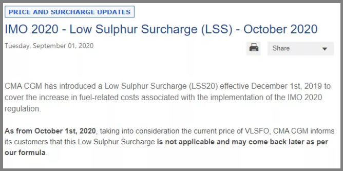 Dynamar的高级航运分析师兼顾问瓦迪说:“据报道,目前拉各斯港的船只等待时间已达五十(50)天,据说有约1000辆集装箱卡车的出口货物被困在港口的路边。”尼日利亚港口管理局(NPA)指责在拉各斯经营Apapa码头的APM码头缺乏集装箱装卸设备,该设备导致该港口积压了货物。此前《卫报》采访了相关在尼日利亚码头的相关工作者了解到:在尼日利亚,码头费约为457美元,运费为374美元,而当地从港口到仓库的运费约为2050美元。SBM的一份情报报告也显示,与加纳和南非的货物相比,从欧盟运往尼日利亚的货物费用更昂贵。8月初贝贾亚(Bejaia)港口工人进行了为期19天的罢工,目前罢工已于8月20号结束。但因此该港口目前的船只靠泊顺序在7至10天之间遭受严重的拥堵,并产生以下影响:因此,港口规定从全球各国发往贝贾亚的船只都需要提交拥堵附加费,每箱标准为100美元/ 85欧元。申请日期从2020年8月24日开始。超过70艘船舶在巴西桑托斯港口排队,预计全部装运完毕需1个月。为了减轻因“限硫令”的实施而造成船用燃料成本的增加,航运公司去年引入了低硫燃油附加费。然而由于燃油价格暴跌,是否继续维持低硫附加费也一直是托运人的争论焦点,他们批评航运公司在取消这一额外费用方面行动迟缓。据悉,航运公司CMA CGM发布公告表示,自2019年12月1日起实施的LSS20(低硫附加费)将不再适用。该航运公司表示:“从2020年10月1日起,考虑到当前极低硫燃料油(VLSFO)的价格,此附加费将不再适用。”不过,该承运公司补充说,附加费“可能会根据我们的公式,以后还会进行调整”。与此同时,赫伯罗特也在官网发布通知表示,将从10月1日起,生效新修订的燃油附加费标准(MFR)。此外,万海航运也依据6月至8月的燃油价格,调整了燃油附加费WBS,适用于10月1日至12月31日。目前,鹿特丹市场上的极低硫燃料油(VLSFO)价格约为320美元/吨,相比之下,只有安装了尾气净化洗涤器的船舶才可以使用重质燃料油(HFO),价格约为275美元/吨。在IMO 2020实施时,VLSFO的价格约为每吨600美元,而之前的行业标准HFO每吨则为300美元。但是在疫情最严重的时候,油价暴跌,VLSFO的船用燃料价格跌至每吨190美元的低点。燃料成本的急剧下降,加上运费的上涨,促使大多数航运公司在第二季度实现了意想不到的高利润。